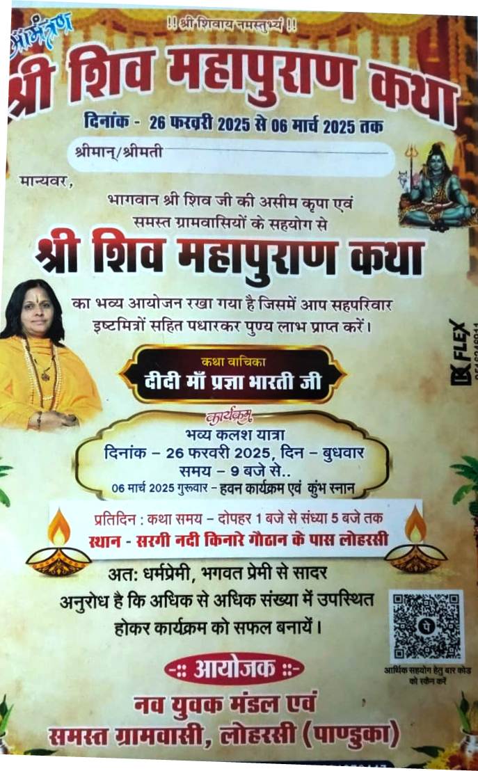 राजिम :- नव युवक मंडल एवं समस्त ग्रामवासी लोहर्सी के संयुक्त तत्वाधान में गाँव के गोठान और सरगी नाला नया पुल के पास आज महाशिवरात्रि से शिव महापुराण की कथा प्रारंभ हो रही है जो 06 मार्च को संपन्न होगी. व्यास पीठ पर दीदी माँ प्रज्ञा भारती जी द्वारा शिव महापुराण की कथा का रसपान कराया जायेगा. जिसकी वृहद और व्यापक तैयारी कर ली गई है. आज प्रातः 9 बजे से भव्य कलश यात्रा के साथ शुरू हो रहे इस धार्मिक आयोजन को लेकर गाँव में काफी उत्साह देखने मिल रहा है. शिव भक्तो का लोहर्सी में रेला लगने का अनुमान आयोजको ने व्यक्त किया है